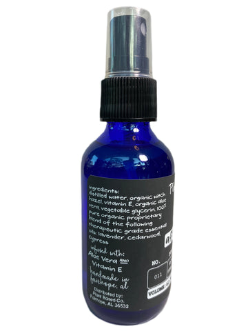 Ingredients: Organic Aloe Vera, Distilled Water, Organic Witch Hazel, Organic Vegetable Glycerin, Organic Vitamin E, 100% Pure Therapeutic-Grade Blend of the Following Essential Oils: Lavender, Cedarwood, and Cypress