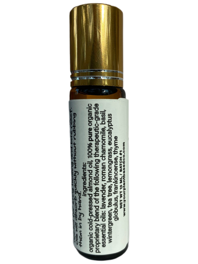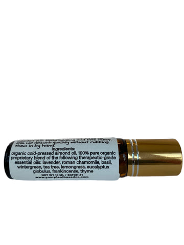 100% pure therapeutic-grade blend of the following essential oils: Lavender, Roman Chamomile, Basil, Wintergreen, Tea Tree, Lemongrass, Eucalyptus, Frankincense, and Thyme