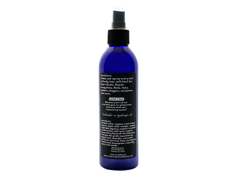Ingredients: Distilled Water, Organic Witch Hazel, Organic Apple Cider Vinegar, Organic Crushed Vanilla Beans,100% pure therapeutic-grade blend of the following Essential Oils: Lavender, Peppermint, Citronella, Geranium, Tea Tree, Basil, Eucalyptus, Cedarwood, Lemongrass, Rosemary, and Clove